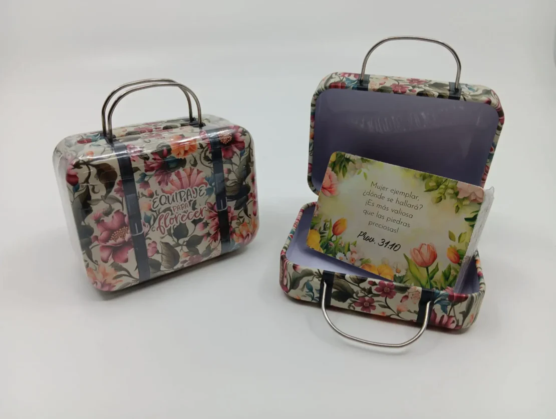 40 tarjetas con promesas bíblicas en caja metálica de bello diseño con forma de maleta.