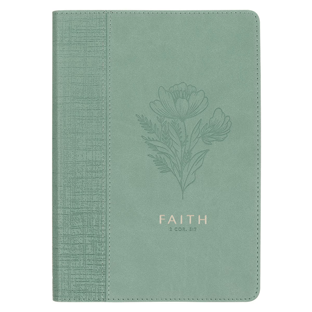 The teal faux leather cover has a two-part design. On the smooth front panel, a heat-debossed floral design steals the show. Below the flower, the sentiment shines in gold-foiled lettering, while the Scripture reference is elegantly heat-debossed.