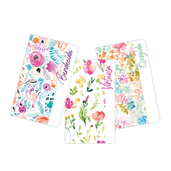 Hermoso set de libretas que, por su tamaño práctico, caben en cualquier bolso. Cada página incluye un versículo bíblico, enfatizando en las palabras: Escogida, Bendecida y Virtuosa.