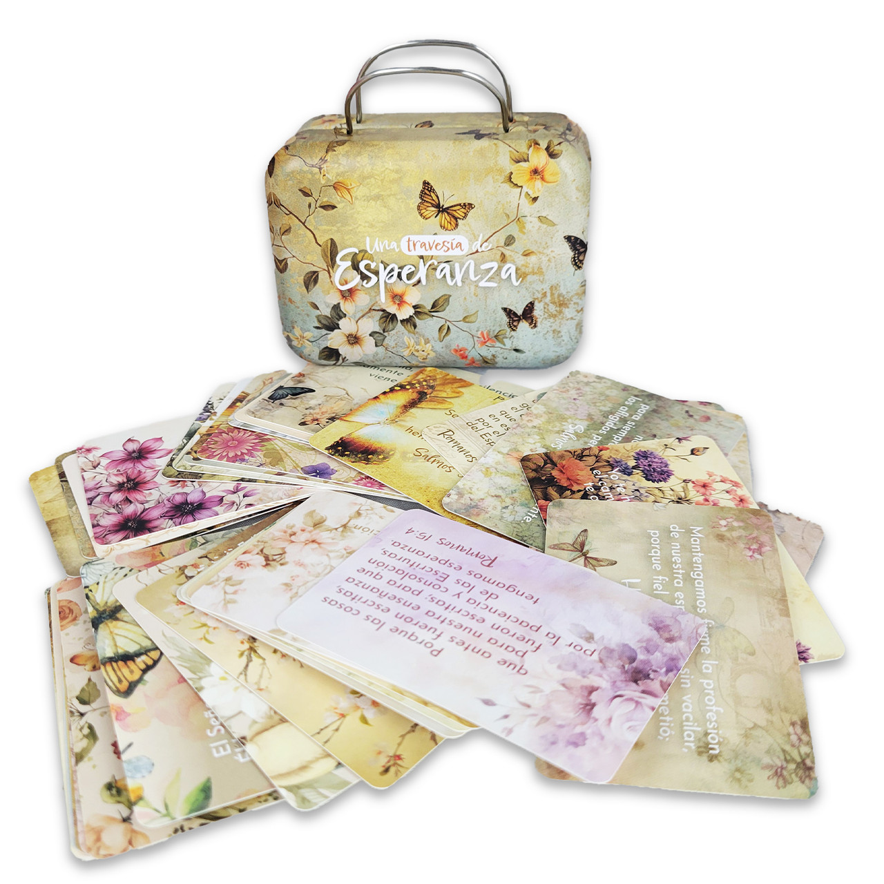 40 tarjetas con promesas bíblicas en caja metálica de bello diseño con forma de maleta.