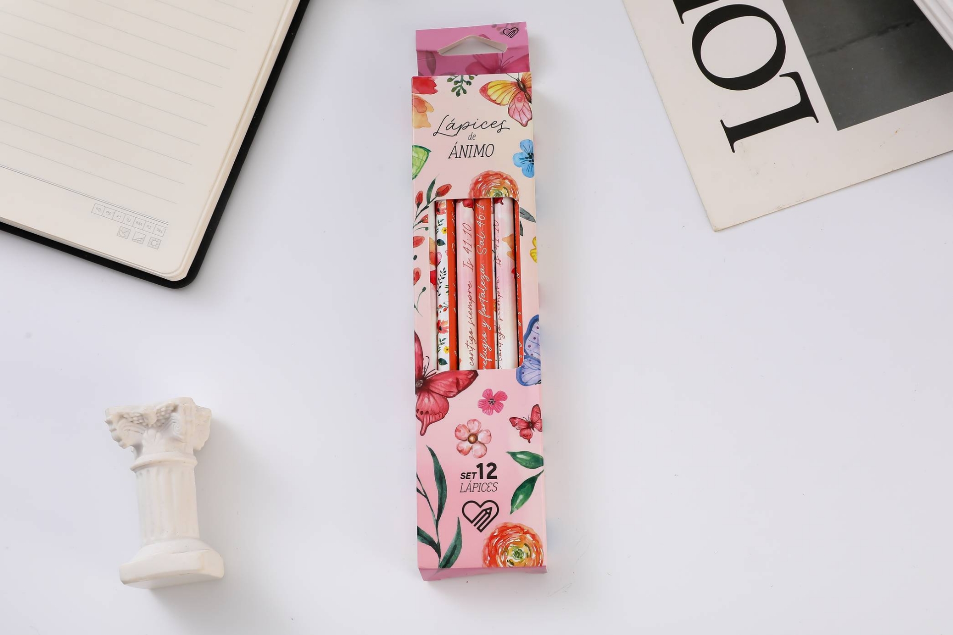 Caja de cartón con 12 lápices con versículos de Ánimo.